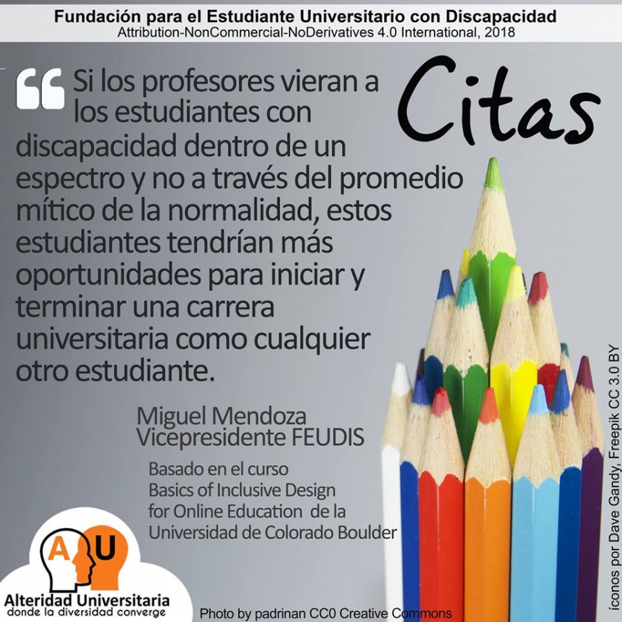 Leemos en la cita: « Si los profesores vieran a los estudiantes con discapacidad dentro de un espectro y no a través del promedio mítico de la normalidad, estos estudiantes tendrían más oportunidades para iniciar y terminar una carrera universitaria como cualquier otro estudiante.» Autor de la cita: Miguel Mendoza, Vicepresidente FEUDIS. Basado en el curso Basics of Inclusive Design for Online Education de la Universidad de Colorado Boulder